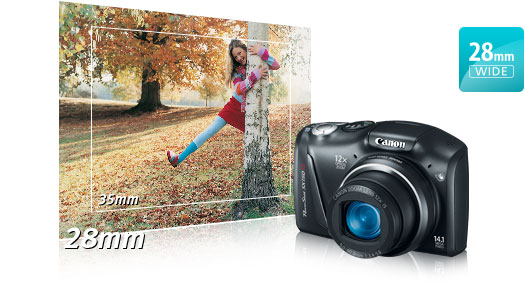 The PowerShot SX150 IS features a powerful Genuine Canon 12x Zoom Lens that delivers outstanding optical performance and versatility. With precision engineering and decades of leadership in optical technologies, Canon has created a bright, wide-angle lens that provides an extraordinary 12x zoom range. The lens starts at 28mm wide-angle and extends to 336mm telephoto (35mm equivalent), giving you tremendous coverage and reach. The telephoto end lets you capture subjects from a considerable distance, while the 28mm wide-angle makes it easy to shoot sweeping landscapes, large groups of people and tall buildings. Moreover, this superlative lens incorporates innovative designs that enable it to fit the compact profile of the PowerShot SX150 IS and perform at high speed with low power consumption.