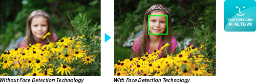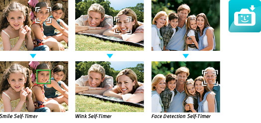 Face Detection technology makes it easy for you to take great photos of people. The camera will automatically detect the face(s) in a frame to give it optimal focus, exposure, flash (if needed) and white balance. Smart Shutter adds fun and convenience to Face Detection because you can set the camera to release the shutter when someone winks, smiles or even enters the frame.